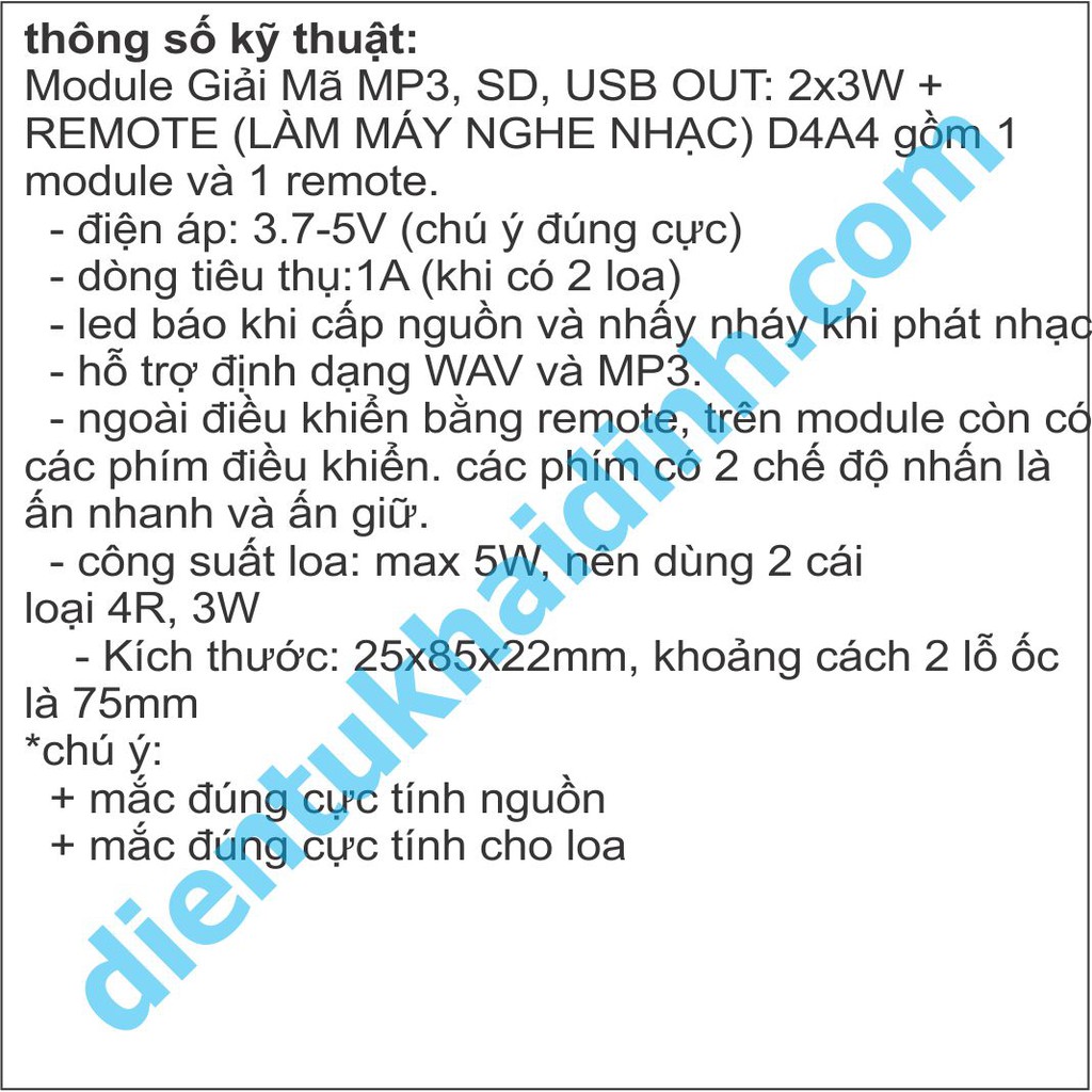 Module Giải Mã MP3, SD, USB OUT: 2x3W + REMOTE (LÀM MÁY NGHE NHẠC) D4A4 kde4331
