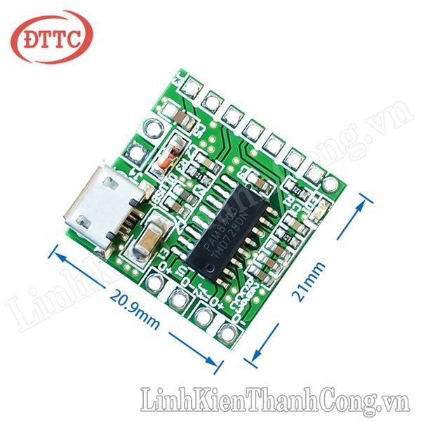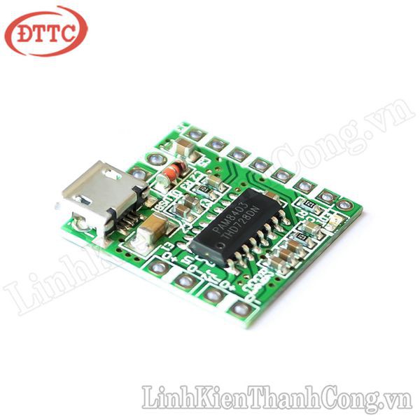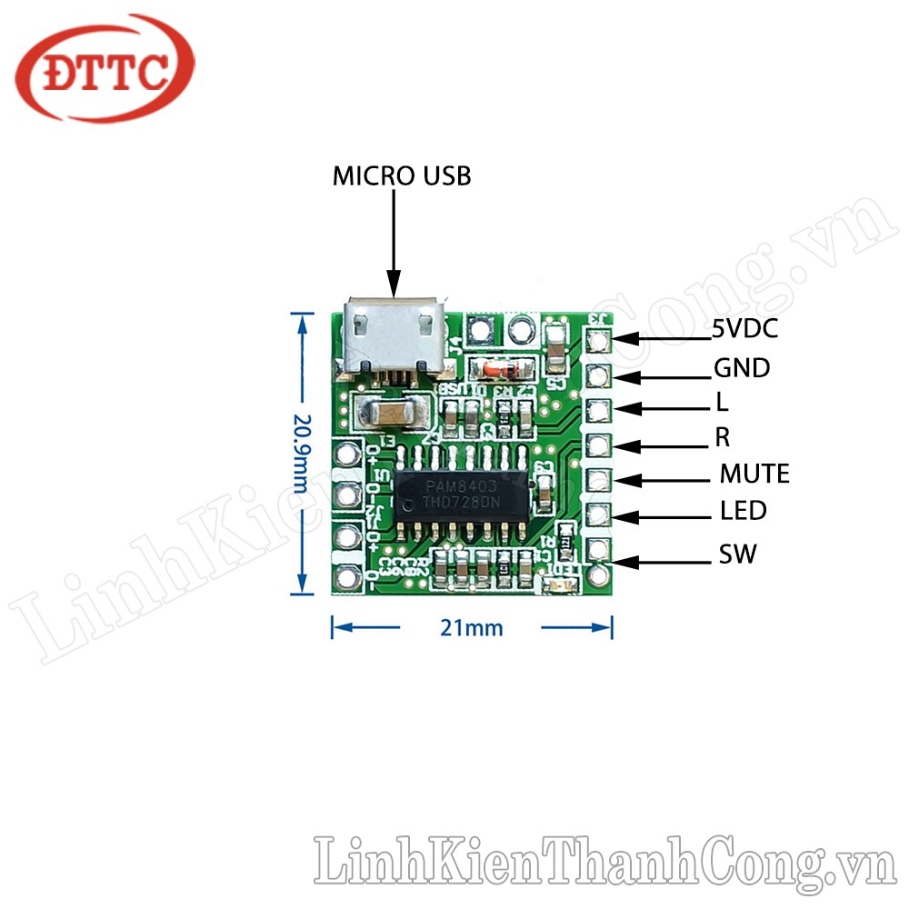 - Module khuếch đại PAM8403 có tích hợp bộ lọc nhiễu cho tín hiệu tốt hơn, để mạch đủ công xuất 3W cho mỗi kênh thì nguồn đầu vào cần phải là 5V – 1.2A, có thể kết nối trực tiếp với loa 4Ω / 8Ω. Mạch sử dụng IC PAM8403 được thiết kế Class-D được tích hợp bộ lọc L-C, module được thiết kế nhỏ gọn giúp thiết kế những ứng dụng nhỏ gọn và có thể mang đi.
