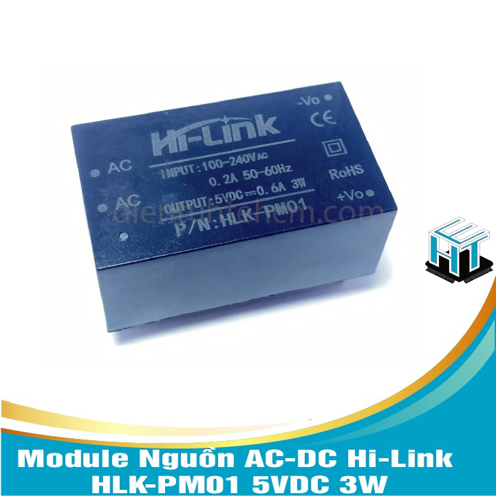 Module Nguồn AC-DC Hi-Link HLK-PM01 5VDC 3WModule nguồn AC-DC Hi-Link HLK-PM01 5VDC 3W có thiết kế nhỏ gọn với vỏ bọc nhựa an toàn, chuyên nghiệp, được sử dụng để chuyển nguồn xoay chiều AC sang 5VDC công suất tối đa 3W cấp cho thiết bị, module được sản xuất bởi hãng Hi-Link chuyên về các module nguồn được sử dụng trong công nghiệp với độ bền, chống nhiễu tốt và độ an toàn cao.