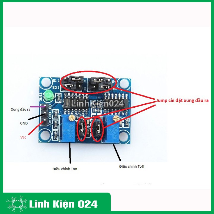 Với việc cắm jump ở S1 đến S6 ta sẽ thiết lập khoảng rộng cho TON và TOFF , đồng thời dùng 2 biến trở để điều chỉnh chính xác khoảng rộng của TON và TOFF