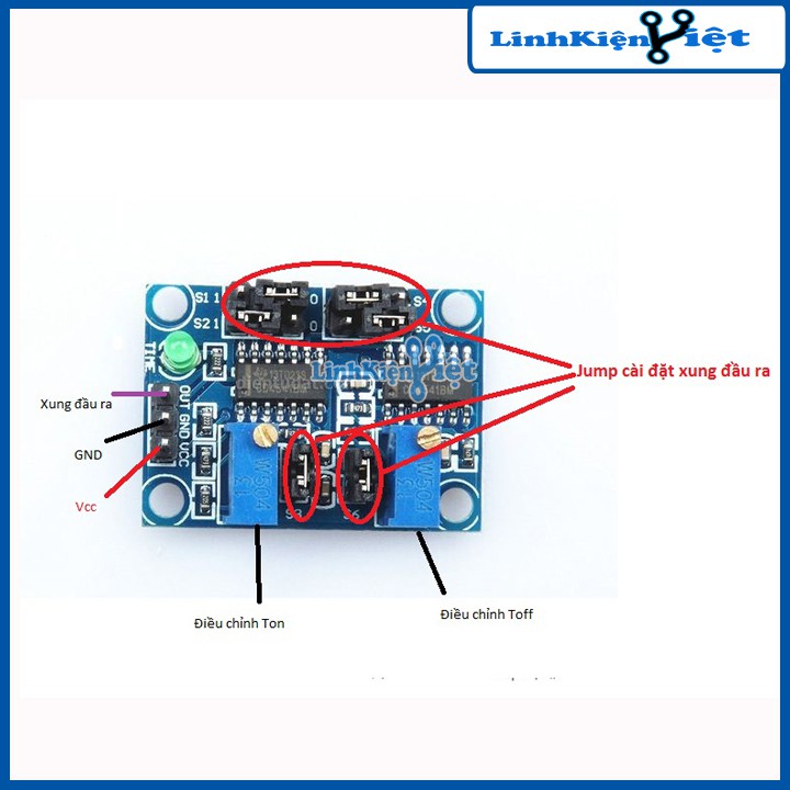 Với việc cắm jump ở S1 đến S6 ta sẽ thiết lập khoảng rộng cho TON và TOFF , đồng thời dùng 2 biến trở để điều chỉnh chính xác khoảng rộng của TON và TOFF