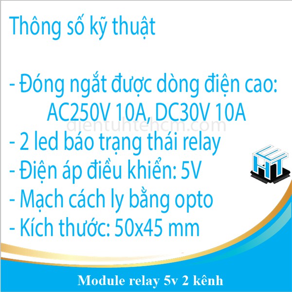 Module Relay 2-Channel 5VModule Relay 2-Channel 5V được dùng nhiều trong các ứng dụng đóng ngắt các thiết bị tiêu thụ dòng điện lớn (<10A). Module có thể đóng ngắt cùng lúc hai kênh bằng tín hiệu điều khiển ( với mức điện áp 3V3 hoặc 5V) từ các vi điều khiển khác nhau như: Arduino, 8051, AVR, PIC, DSP, ARM, ARM, MSP430, logic TTL, đồng thời module được cách ly bằng optocoupler giúp bảo vệ tốt hơn cho các vi điều khiển.