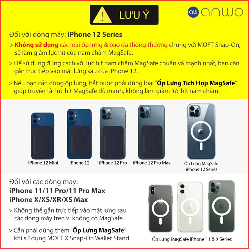 ⚠️ Không sử dụng các loại ốp lưng & bao da thông thường chung với MOFT Snap-On, sẽ làm giảm lực hít của nam châm MagSafe.
