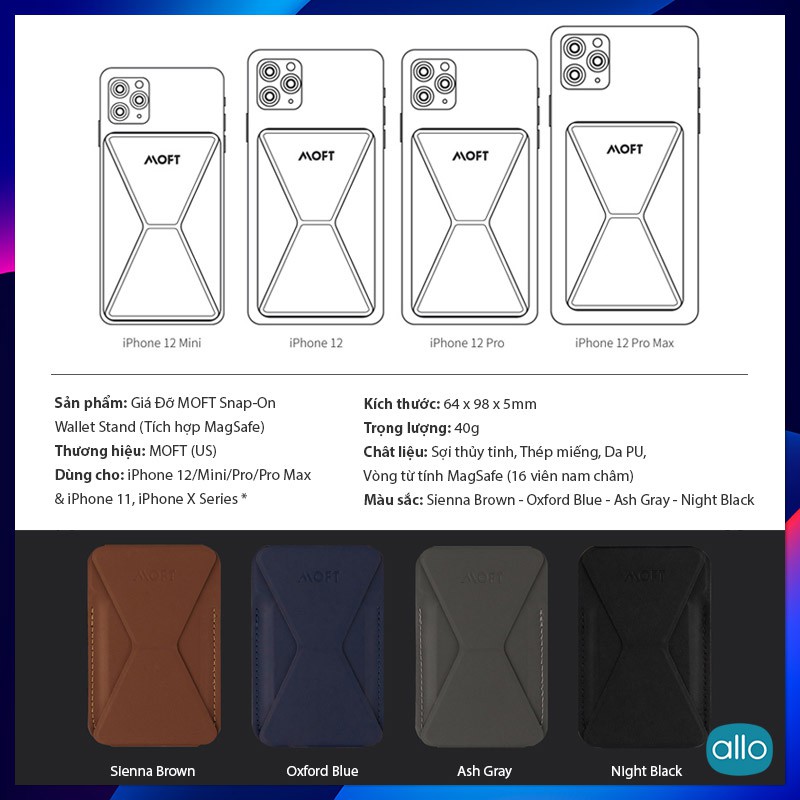 🔷 Moft Snap-On Wallet Stand "MagSafe" : 👉 Phiên bản cho iPhone 12, tích hợp khe để thể (gắn tháo bằng từ tính)