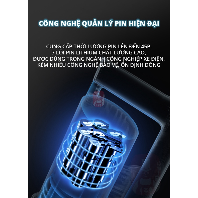 5. Công nghệ quản lí pin hiện đại, tối ưu hơn 50% pin so với các thế hệ máy hút bụi cầm tay trước của hãng, cung cấp thời lượng pin lên đến 45 phút nhờ 7 lõi pin Lithium chất lượng cao