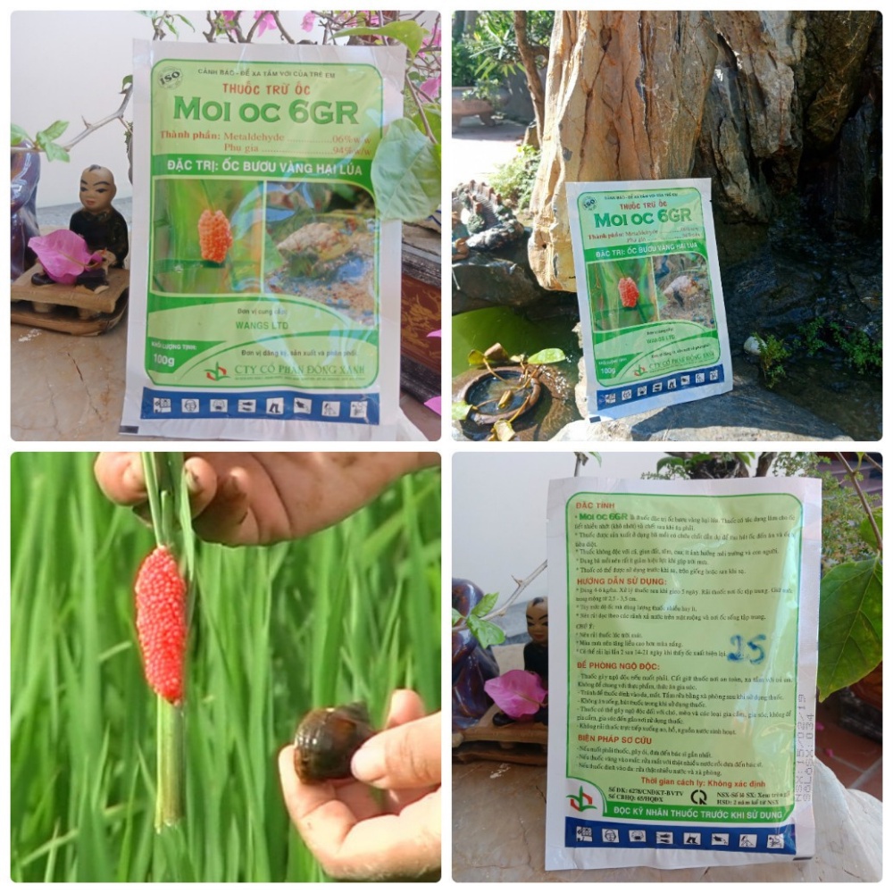 - Rải bả tại vị trí ốc tập trung, và rải dọc các mương, xung quanh gốc cây, tán lá dọc luống, lưu ý nên giữ nước trong ruộng từ 2 – 4 cm.