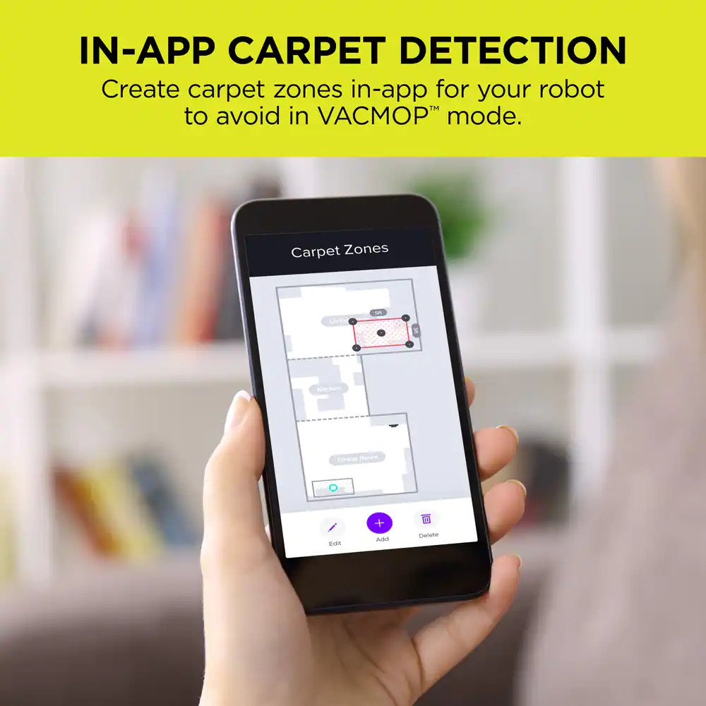 **VACMOP™ MODE: Hút và Lau rung đồng thời được trang bị trên 1 Robot— tránh thảm với tính năng phát hiện thảm trong ứng dụng.