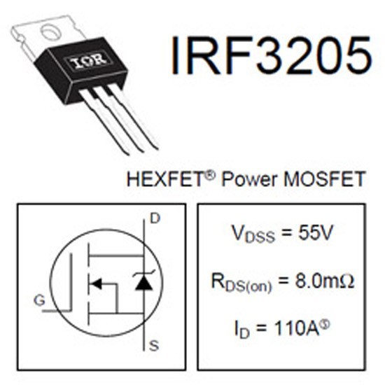 Mosfet IRF3205 là Transistor hiệu ứng trường (Metal Oxide Semiconductor Field Effect Transistor) là một Transistor đặc biệt có cấu tạo và hoạt động khác với Transistor thông thường. Mosfet thường có công suất lớn hơn rất nhiều so với BJT, Mosfet IRF3205 có công suất là 220W. Đối với tín hiệu 1 chiều thì nó coi như là 1 khóa đóng mở.