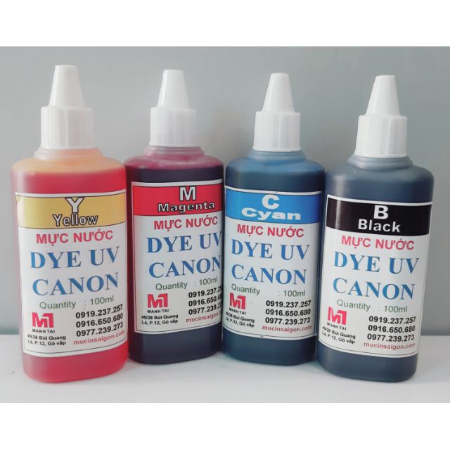 * Mực nước Dye UV Canon là loại mực in dùng được cho máy in HP/Canon có có hệ thống mực bên ngoài. Chất lượng mực in cao cấp, màu sắc chân thật, chuẩn màu.* Có 4 màu : đen, xanh, đỏ, vàng