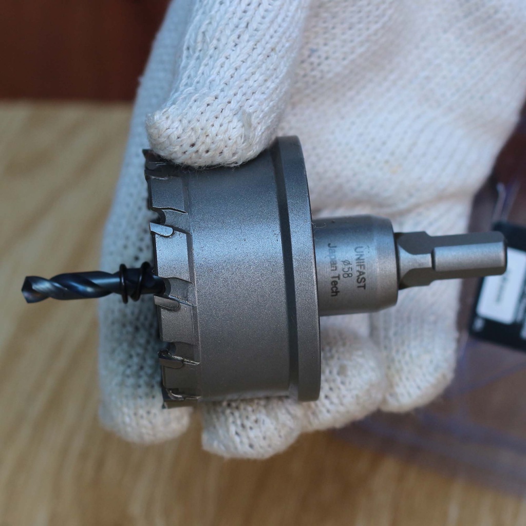 - Mũi khoét Unifast phi 58 có trang bị thêm một mũi khoan tâm 6mm giúp định vị chính xác lỗ khoan.