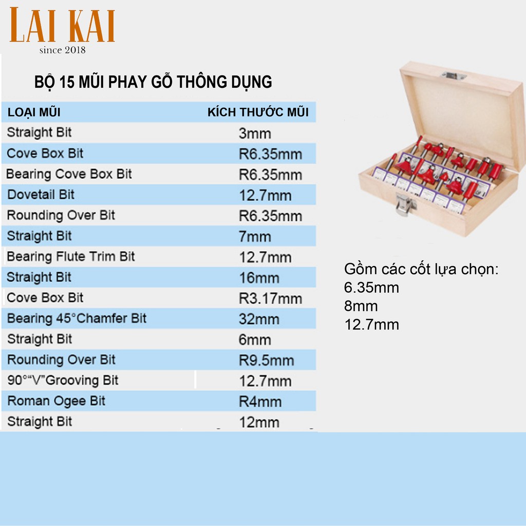 15 mũi phay thông dụng với hai lựa chọn cốt (đường kính thân mũi):