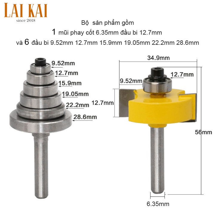 Bộ sản phẩm gồm 1 mũi phay cốt 6.35 hoặc 12.7mm (chọn trong phân loại hàng) với đầu bi 12.7mm và6 bi gồm 9.52mm 12.7mm 15.9mm 19.05mm 22.2mm 28.6mm