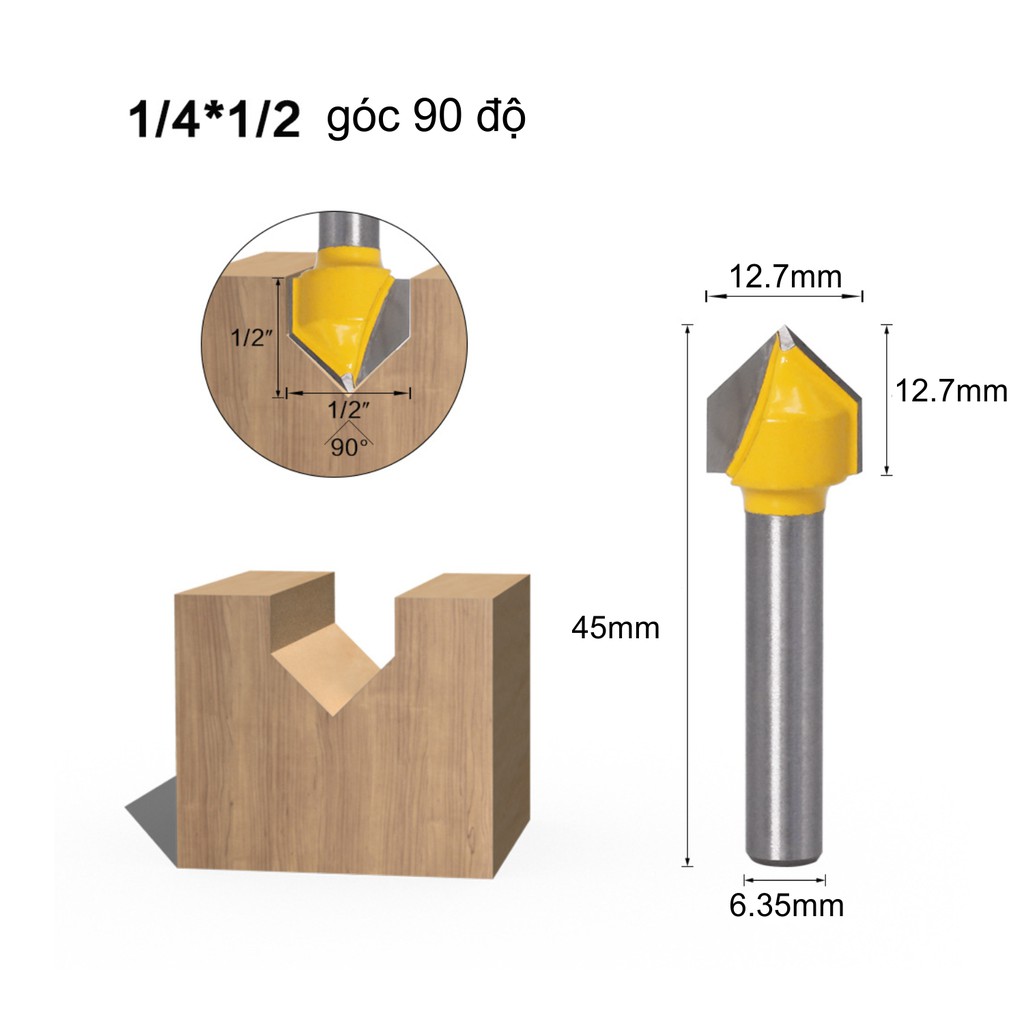 Nhà cửa & Đời sống > Dụng cụ & Thiết bị tiện ích > Dụng cụ > Cưa, máy cắt & máy mài || Mui soi gỗ, Mũi phay gỗ phay rãnh V 90 độ, cốt 6.35mm -P_VA060071Còn hàng