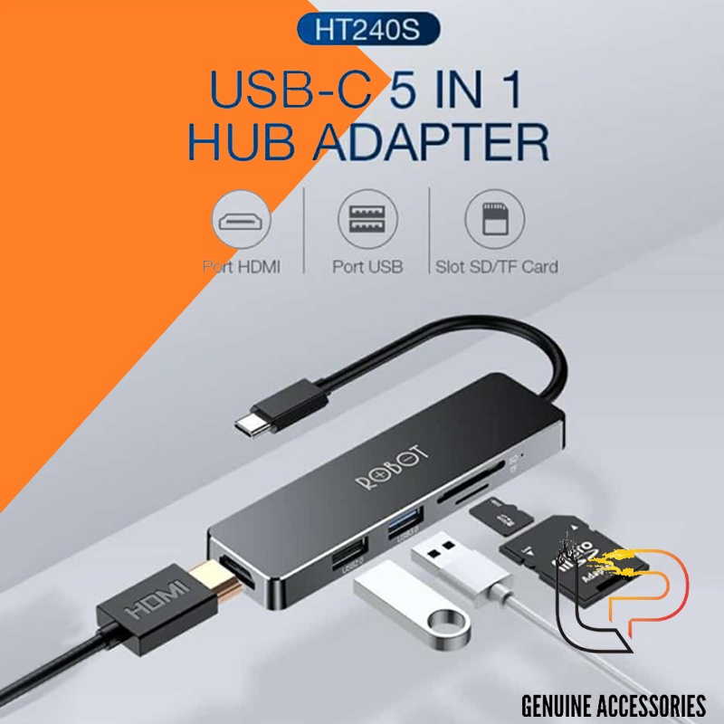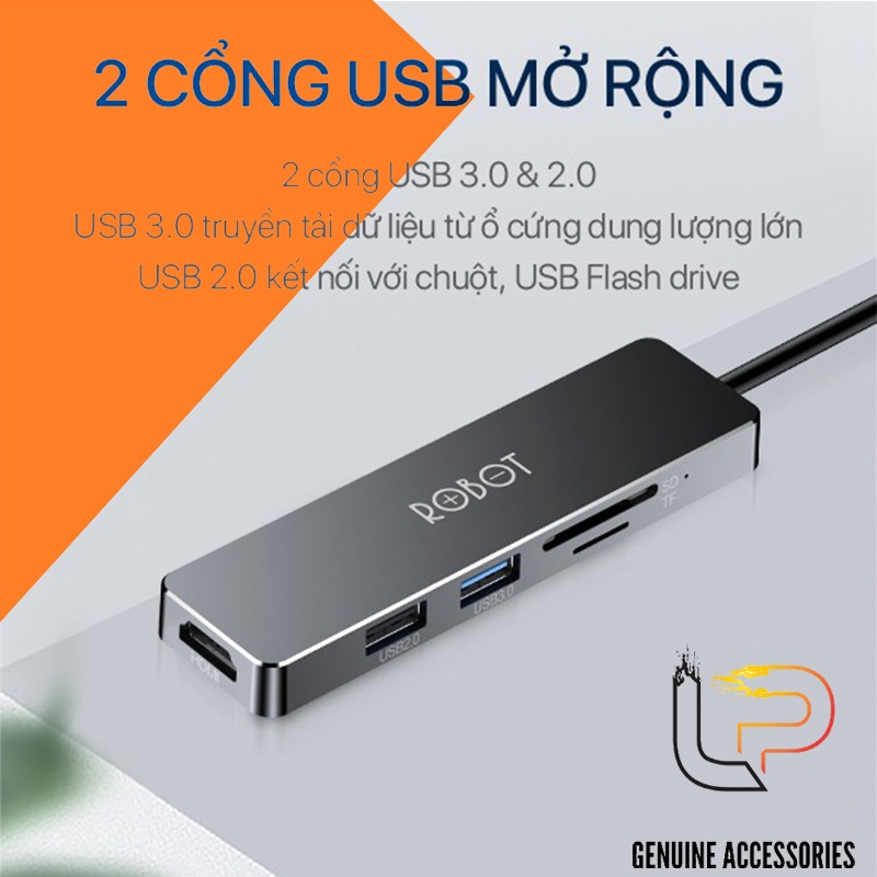 HUB CHUYỂN ĐỔI ĐA NĂNG 5 TRONG 1 ROBOT HT240S TỪ CỔNG TYPE-C SANG CỔNG USB 3.0/ HDMI/ SD/ MICRO SDModel: HT240Y