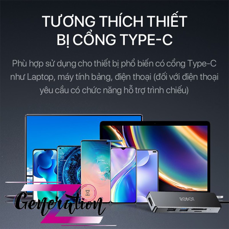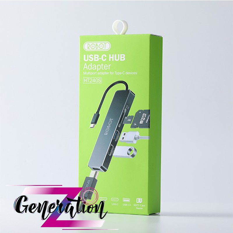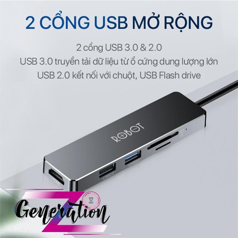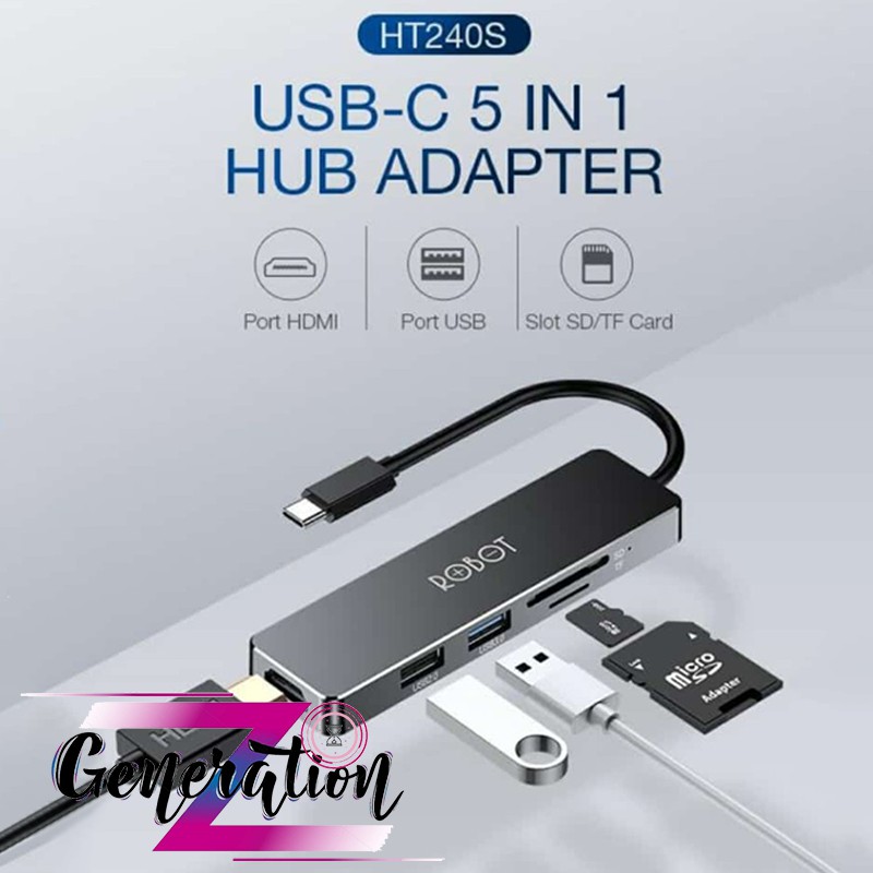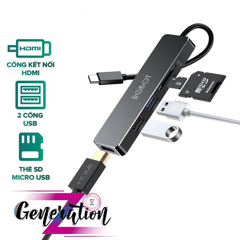 HUB CHUYỂN ĐỔI ĐA NĂNG 5 TRONG 1 ROBOT HT240S TỪ CỔNG TYPE-C SANG CỔNG USB 3.0/ HDMI/ SD/ MICRO SDModel: HT240Y