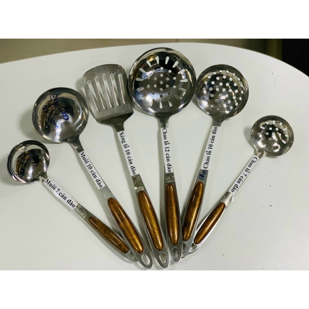 Nhà cửa & Đời sống > Bộ đồ bàn ăn > Bộ dao kéo || Muôi múc canh,muôi thủng inox cán đào,dụng cụ nấu ăn nhà bếpCòn hàng