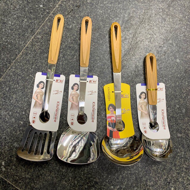 muôi xẻng nấu bếp inox sáng bóng cán vân gỗ