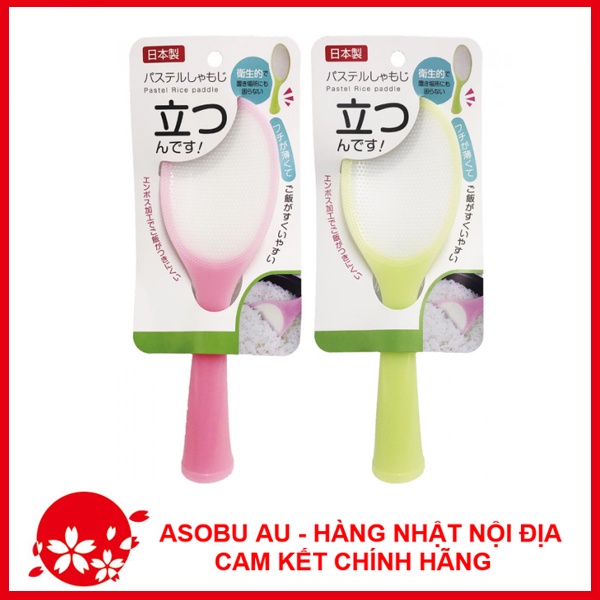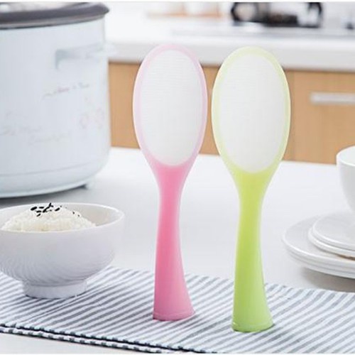 - Công dụng: Bề mặt chống dính tuyệt hảo. Có thể đặt muôi cơm tự đứng vững được trên bàn ăn, giúp muôi cơm luôn sạch sẽ. Màu sắc: Hồng nhạt và Xanh lá cây