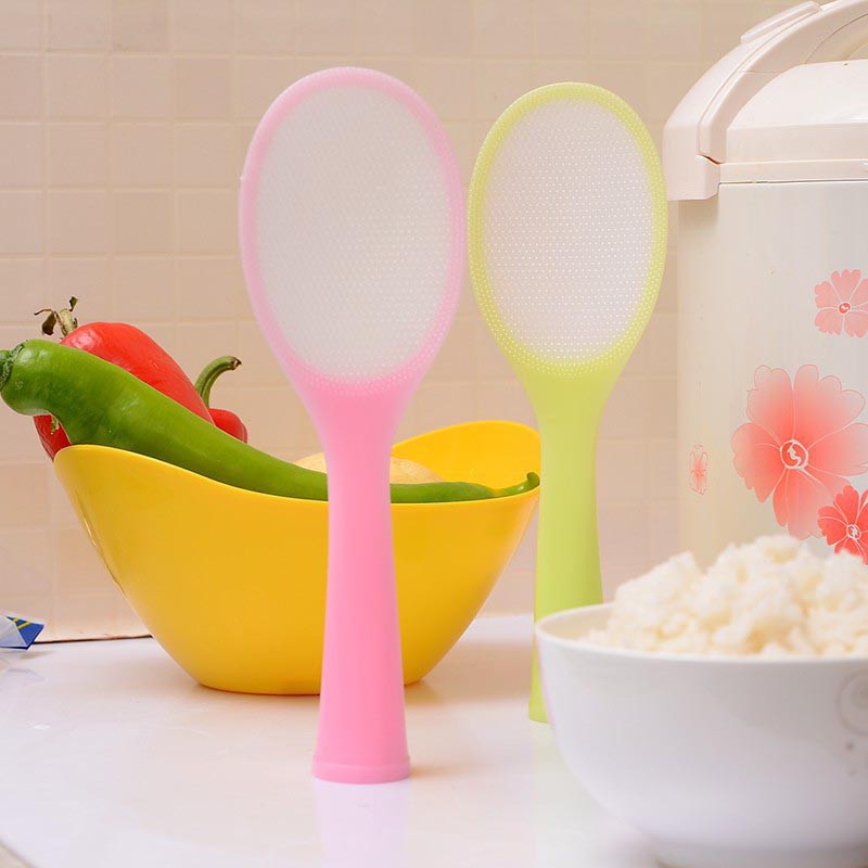 Công dụng: Bề mặt chống dính tuyệt hảo. Có thể đặt muôi cơm tự đứng vững được trên bàn ăn, giúp muôi cơm luôn sạch sẽ. Màu sắc: Hồng nhạt và Xanh lá cây