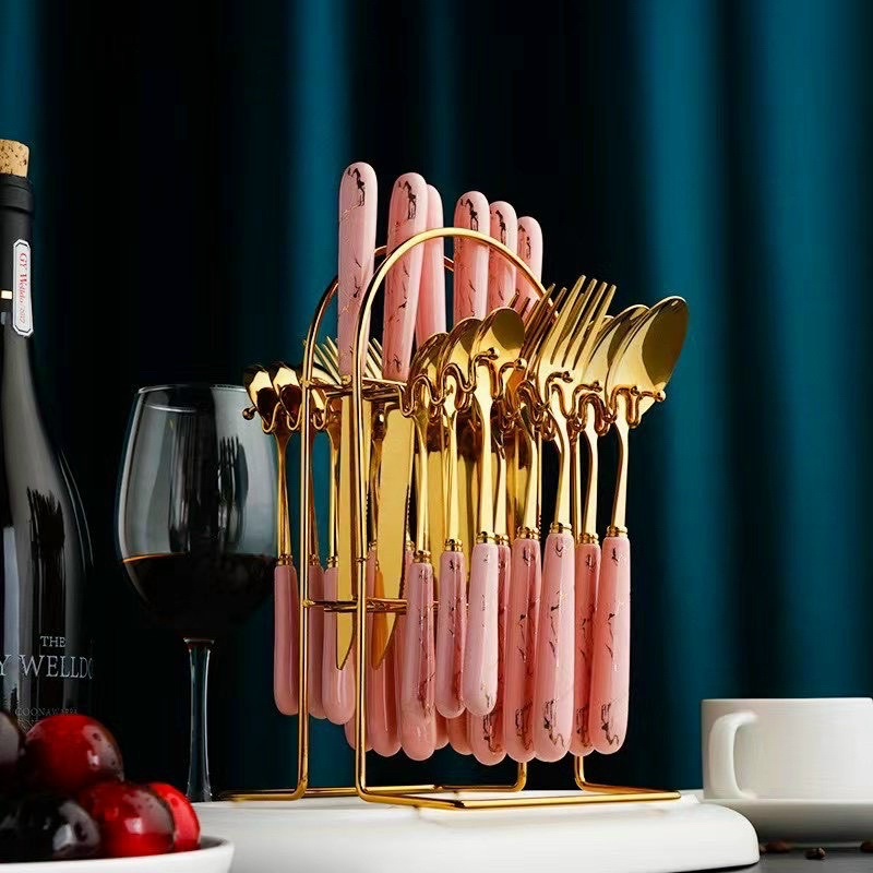 Muỗng Dao Dĩa Thìa Cafe 24 Món, Cán Sứ Và Đầu Muỗng Mạ Vàng Cao Cấp, Kèm Giá Treo Tiện Lợi Cam Homeware