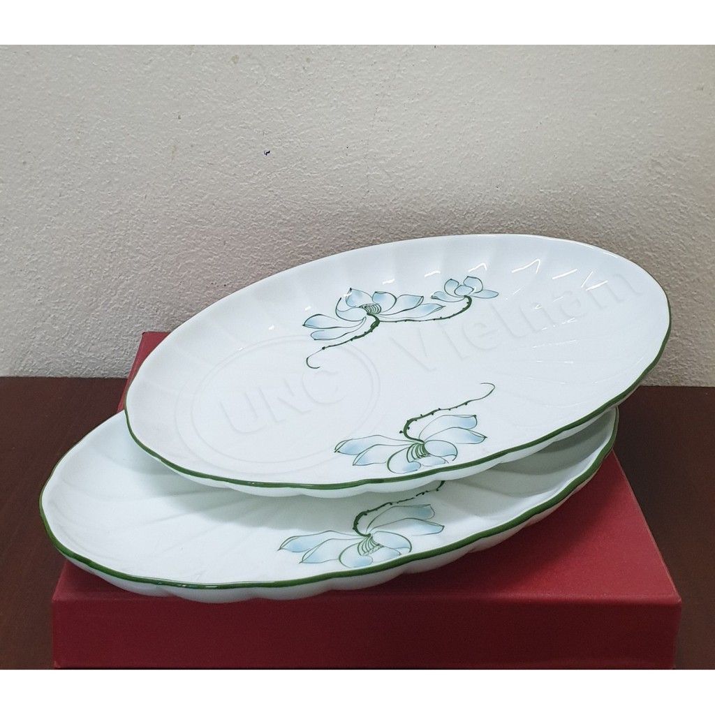 Nhà cửa & Đời sống > Bộ đồ bàn ăn > Dĩa || Bộ đồ ăn sứ UNC Việt Nam - Đĩa kiểu, vẽ Bông Sen Xanh bằng tay 100%, men kem cao cấp, không chứa Chì & CadimiCòn hàng