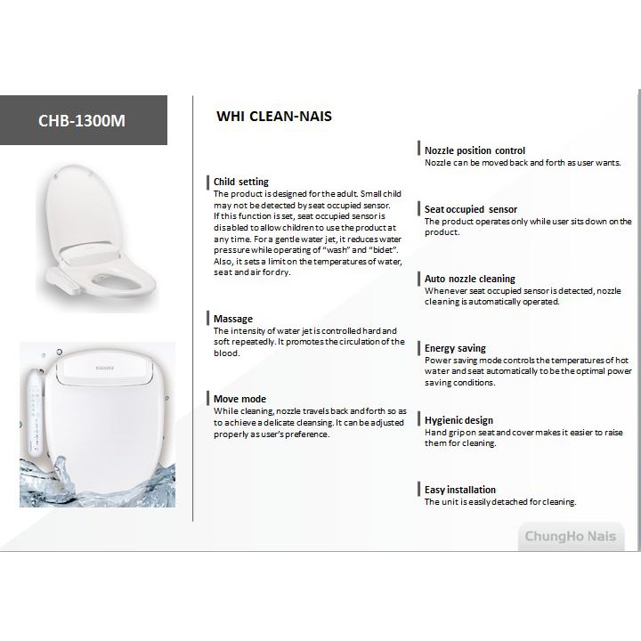 Nhà cửa & Đời sống > Đồ dùng phòng tắm > Bồn cầu, ghế và nắp bồn cầu || Nắp bồn cầu thông minh Chungho CHB-1300SCòn hàng