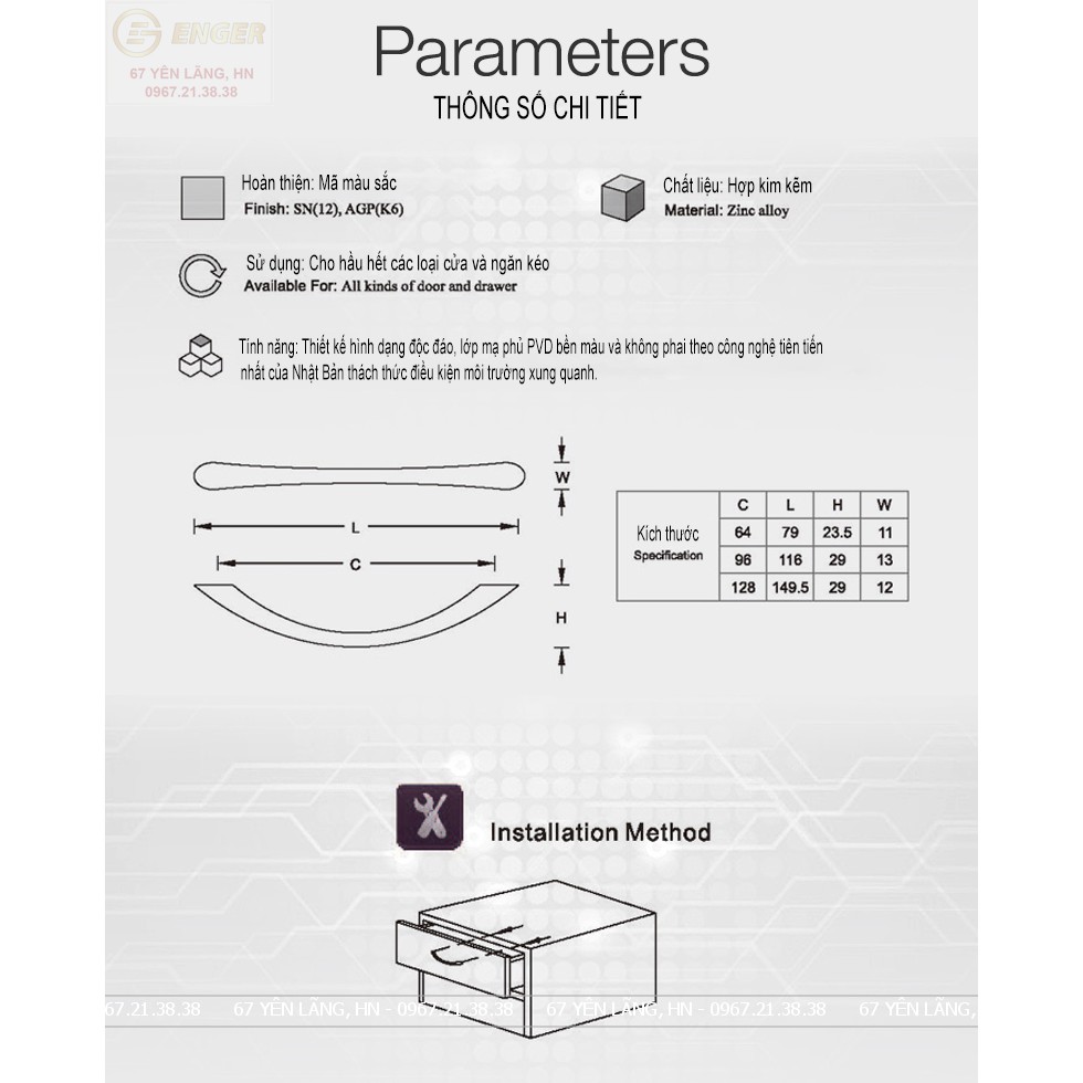 Kích thước (khoảng cách 2 lỗ vít): 64,96,128 mm.
