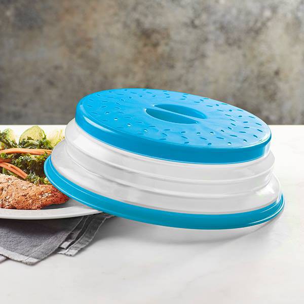 - Nhiều lỗ đục lỗ cho phép hơi nước để thoát ra, giữ ẩm thực phẩm. Cũng chính những lỗ hơi này cho phép chiếc nắp úp vi sóng có thể sử dụng như 1 chiếc rổ để rửa rau quả...
