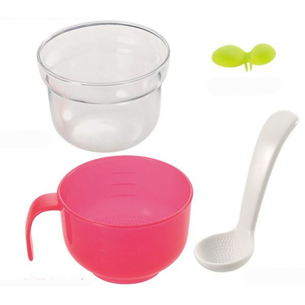 Cốc đựng bằng nhựa, có tay cầm, có vạch chia ml để đong nước, đáy cốc có các hạt sần để nghiền cơm nát dễ dàng. Cốc có thể dùng làm bát ăn cho bé.