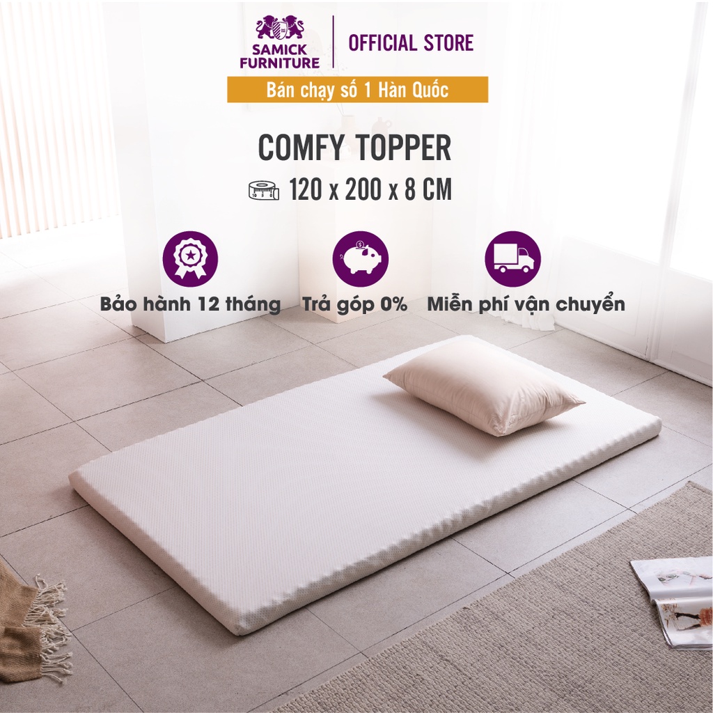 5 LÝ DO ĐẶC BIỆT ĐỂ CHỌN NỆM TOPPER TĂNG TIỆN NGHI SAMICK COMFY✔ Nệm Comfy Topper Samick được nghiên cứu chuyên sâu, được phát triển chuyên biệt để hỗ trợ nâng đỡ tối đa trọng lượng cơ thể, giảm áp cho người nằm. Độ đặc của Cushion là 20kg/m3 tạo nên sự đàn hồi hoàn hảo cho một tấm Topper, cùng với độ dày 8cm, giúp mang lại cảm giác êm ái và thoải mái nhất có thể.