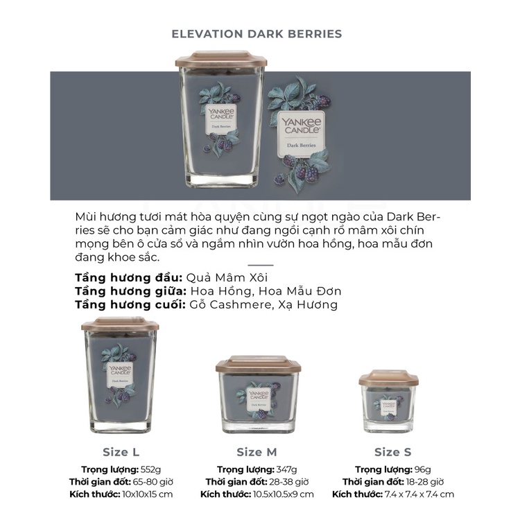 Nhà cửa & Đời sống > Trang trí nhà cửa > Nến & đồ đựng nến || [Mã LIFEMALL991 giảm 10% đơn 99K] Nến ly vuông Elevation Yankee Candle size M - Dark Berries (347g)Còn hàng