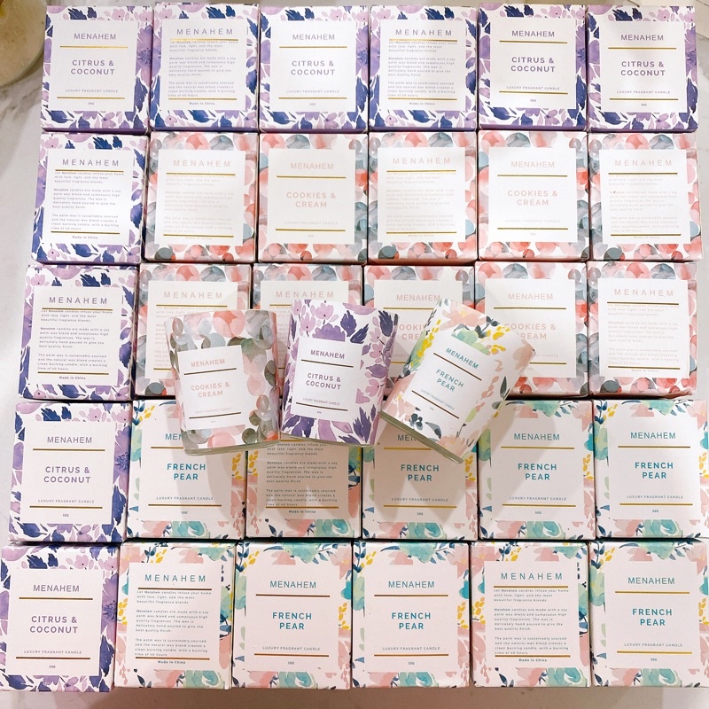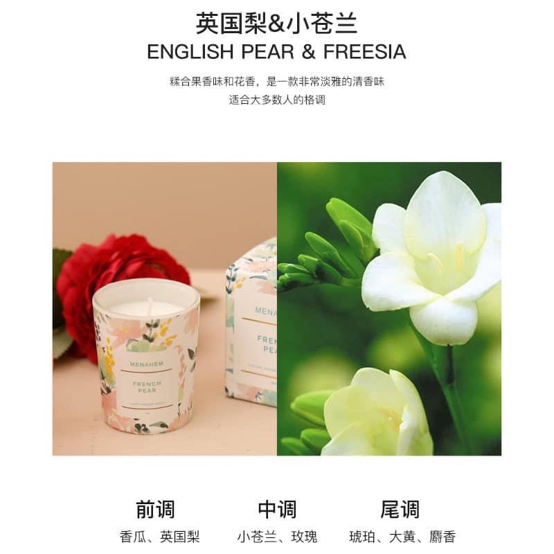 Nến thơm MENAHEM hương thơm tự nhiên, lấy cảm hứng từ sự ngọt ngào trong trẻo của vị bánh ngọt , hoa quả thơm dịu. Đặc biệt sáp nền được làm từ đậu nành và không gây kích ứng da 💕Hương thơm 3 vị tự nhiên :