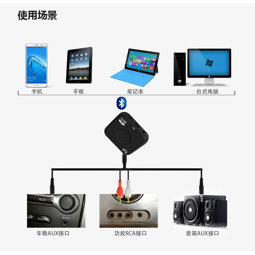 Thiết bị thu tín hiệu âm thanh Bluetooth: Thay đổi loa truyền thống, tai nghe có dây và hệ thống âm thanh nổi trên xe hơi thành loa có hỗ trợ Bluetooth. Sau khi ghép nối, bạn có thể nghe nhạc không dây từ các thiết bị âm thanh hỗ trợ BT.