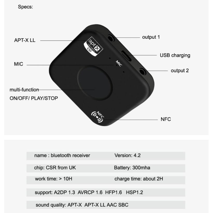 Thiết bị thu Bluetooth được thiết kế đặc biệt cho tai nghe, hệ thống âm thanh nổi trên xe hơi và hệ thống âm thanh gia dụng, thay đổi thiết bị không có Bluetooth thành thiết bị hỗ trợ Bluetooth và dễ dàng ghép nối với điện thoại thông minh, máy tính xách tay, máy tính bảng hỗ trợ Bluetooth, v.v. Với sản phẩm này, bạn có thể tận hưởng âm nhạc từ điện thoại, máy tính xách tay, MP3 và nhiều thiết bị khác mà không gặp rắc rối với dây cáp.