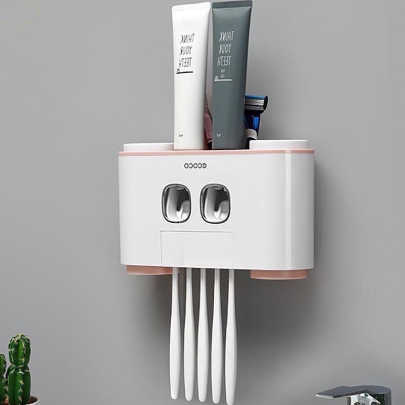 Bộ nhả kem đánh răng tự động Ecoco KHÔNG CẦN KHOAN TỪƠNG, kèm 2 cốc; có thể chứa đựng các vật dụng cá nhân khác trong phòng tắm, với 2 ngăn lấy kèm đánh răng riêng biệt giúp dễ dàng phân loại kem đánh răng của bố mẹ và con giúp việc chăm sóc răng miệng trở nên thuận lợi hơn.