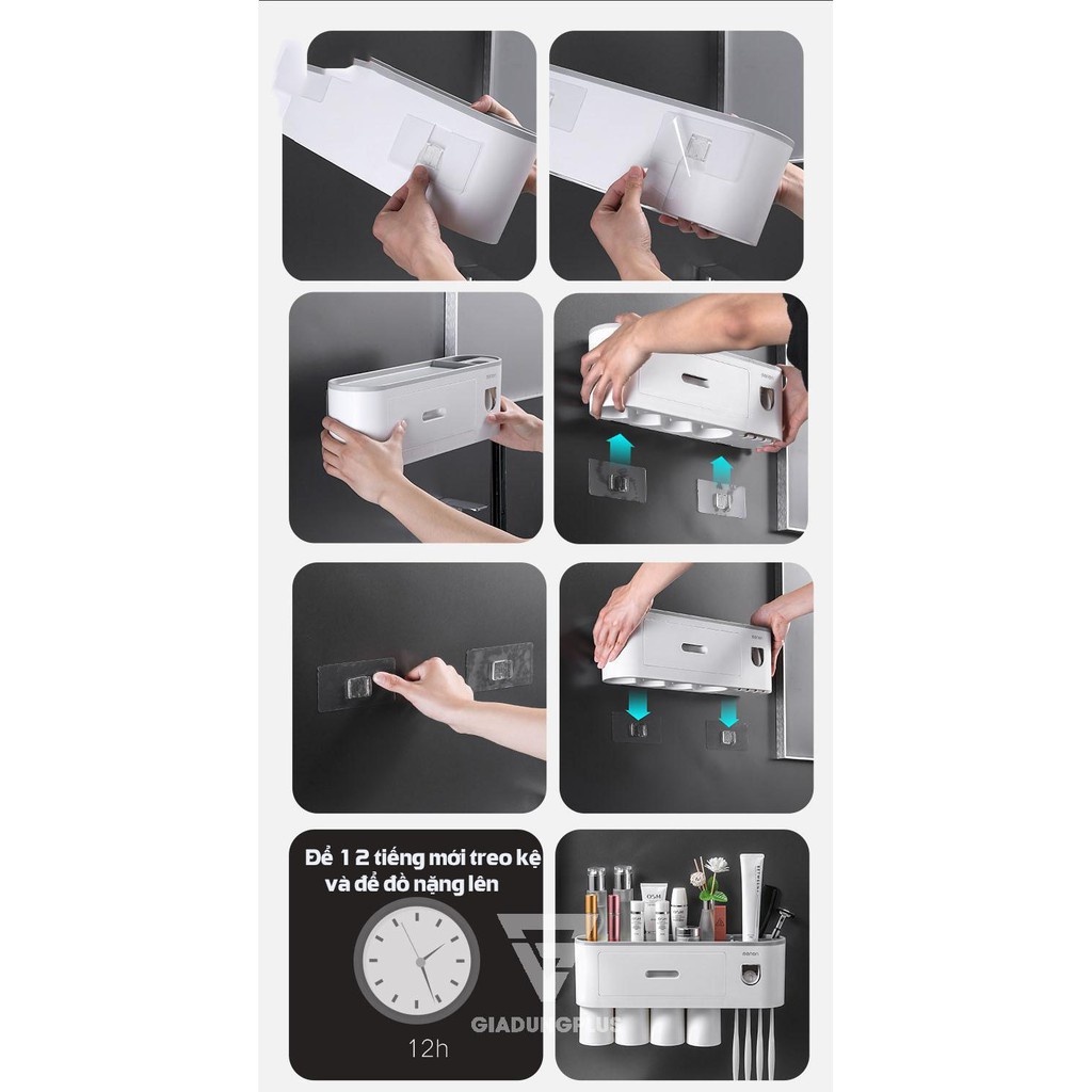 - Sản phẩm gồm: 1 Kệ nhà tắm tích hợp chức năng lấy kem tự động + Cốc hút từ tính + miếng dán tường