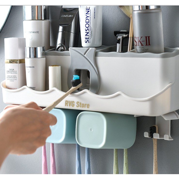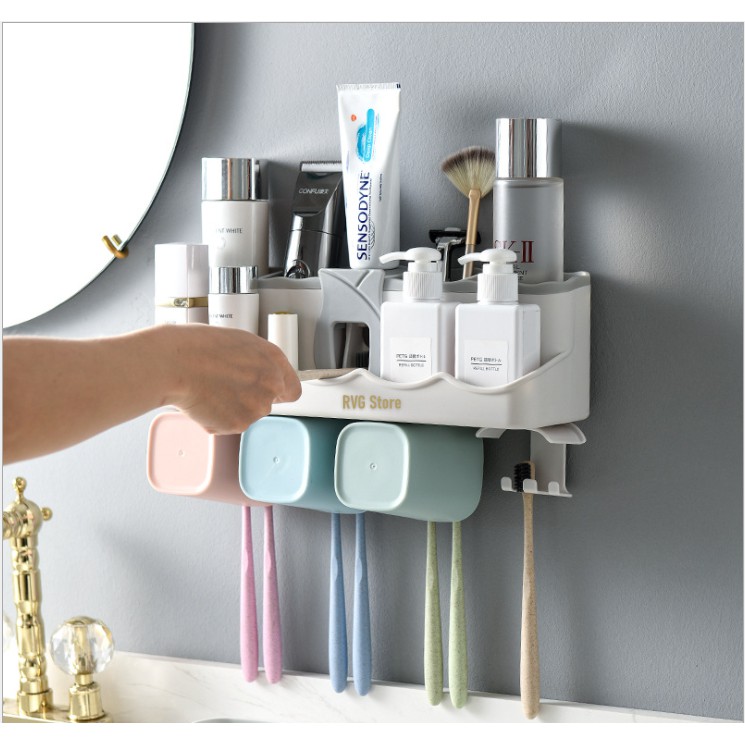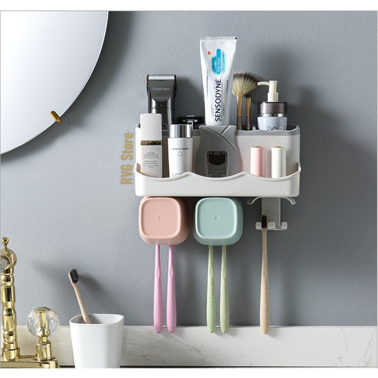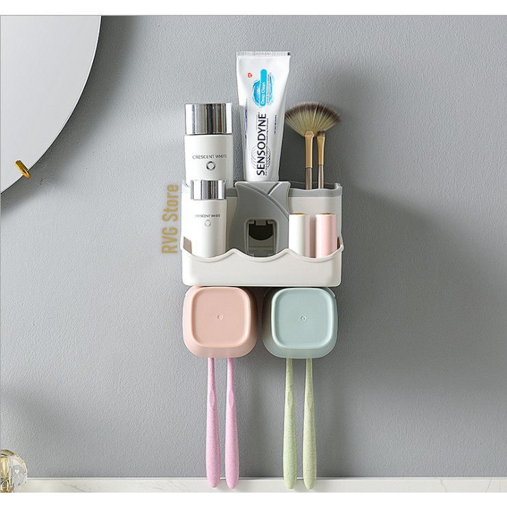 - Bộ sản phẩm gồm: Giá để đồ đa năng Bộ nhả kem đánh răng Tự động + 2 cốc từ tính + bộ dính tường