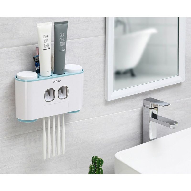 - Bộ nhả kem đánh răng Ecoco bao gồm: + Giá treo 5 bàn chải đánh răng + 2 chỗ chiết kem đánh răng + 4 cốc ( 2 trên 2 dưới ) + 1 khay có thể đựng được lược, cây cạo râu.