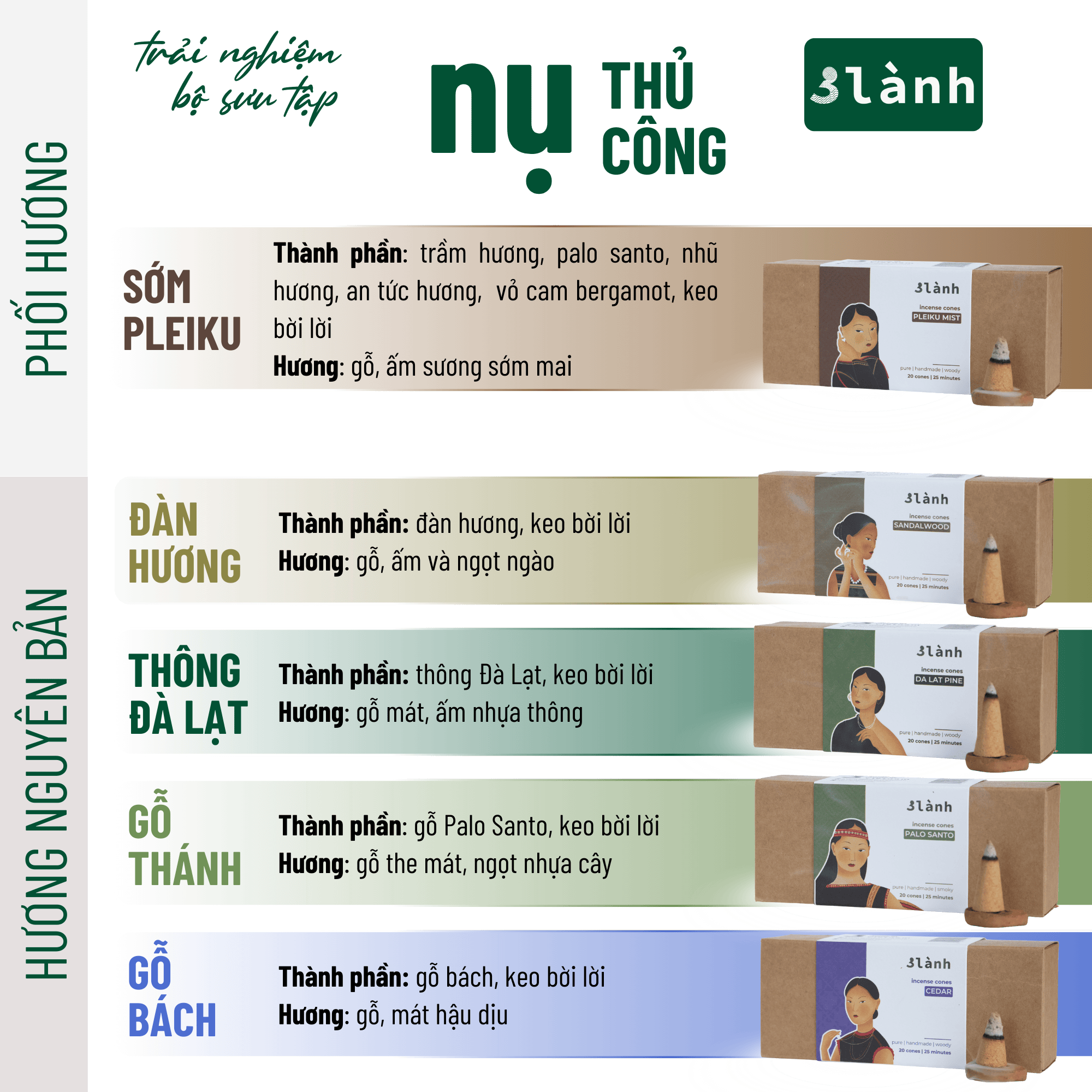 Pleiku Mist (Sớm Pleiku): agarwood (trầm hương), palo santo (gỗ thánh), frankincense (nhũ hương), benzoin siam (an tức hương), bergamot (vỏ cam), keo bời lời. Hương gỗ, ấm sớm mai