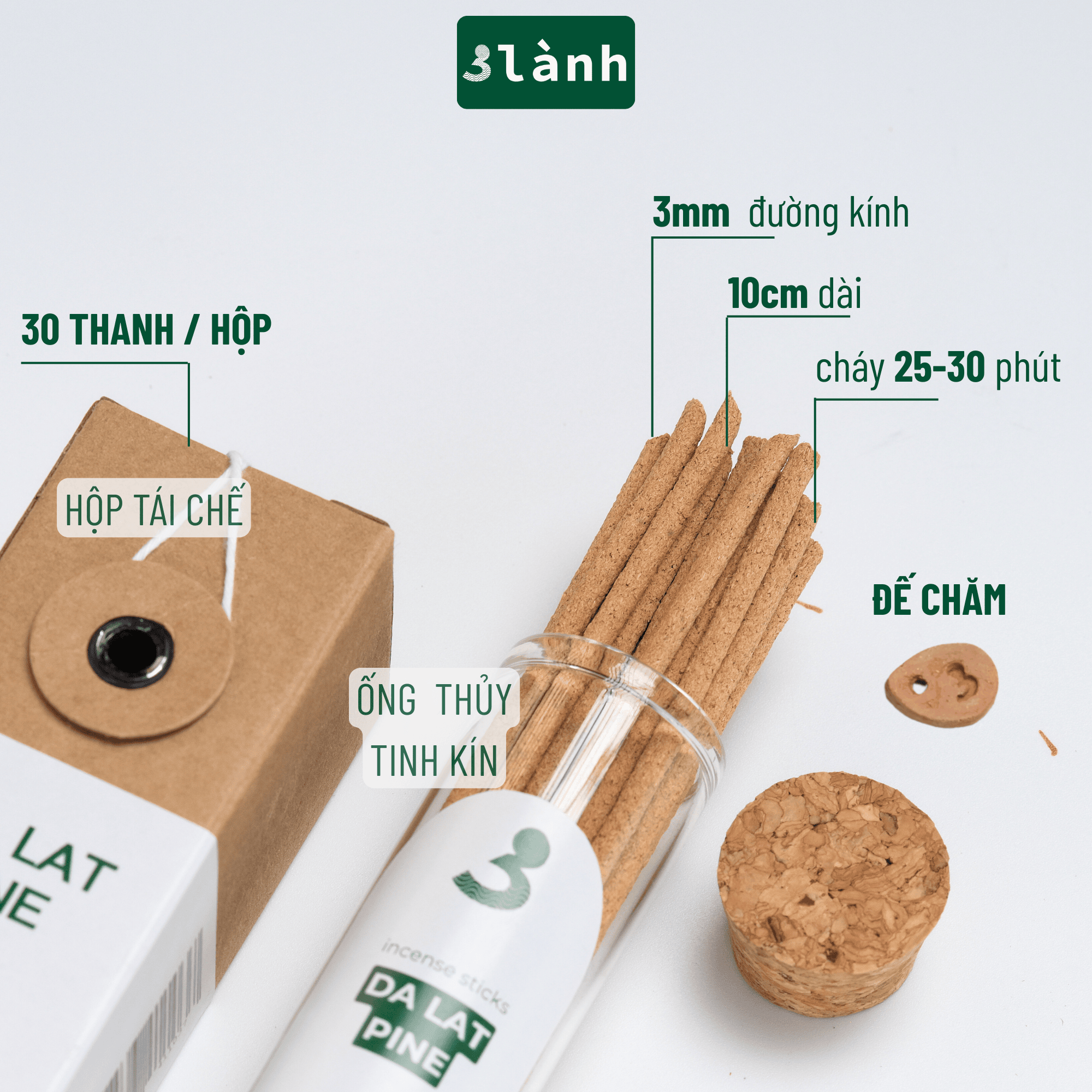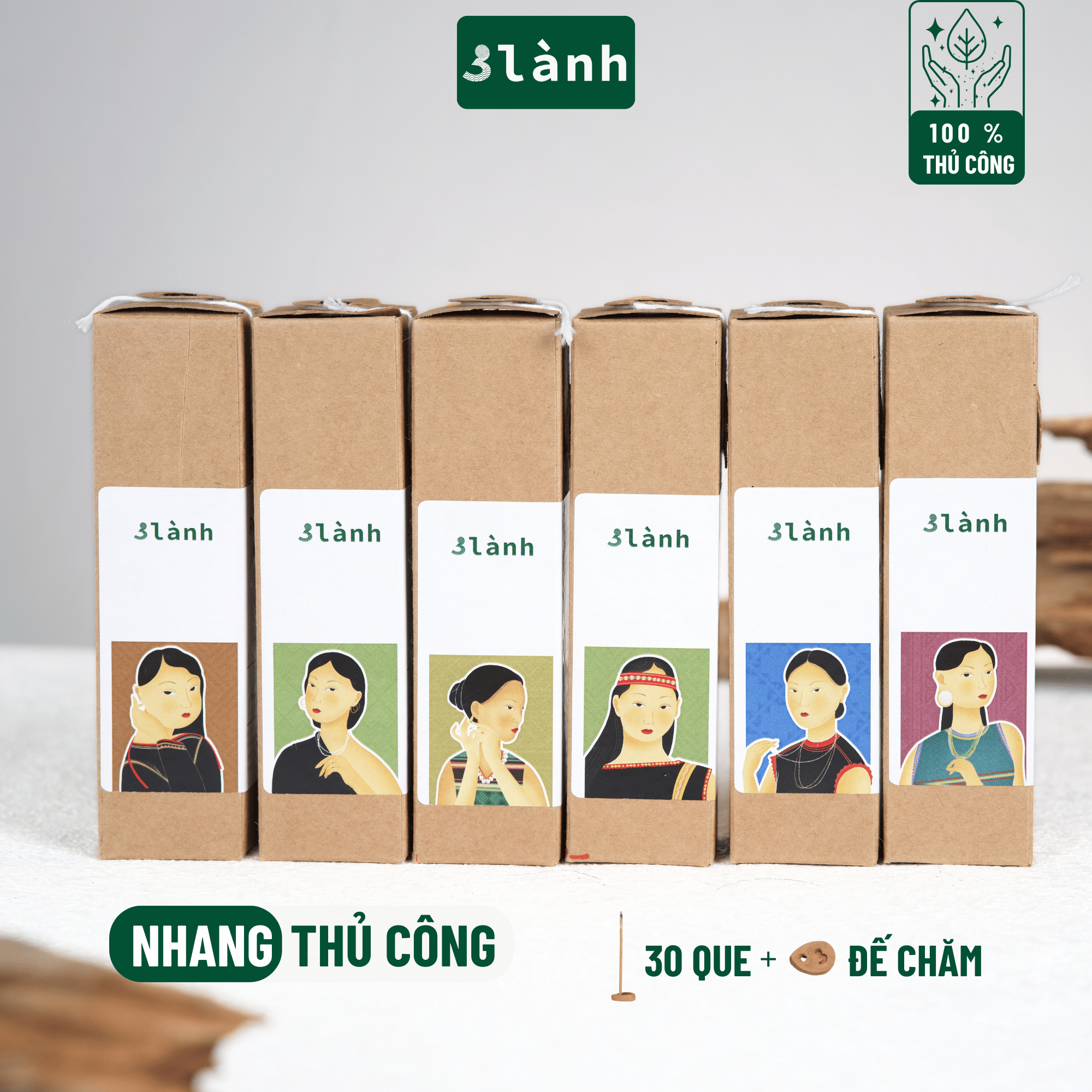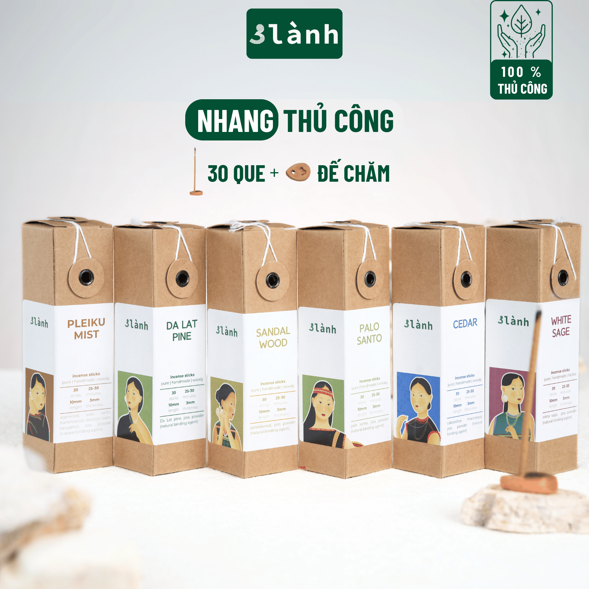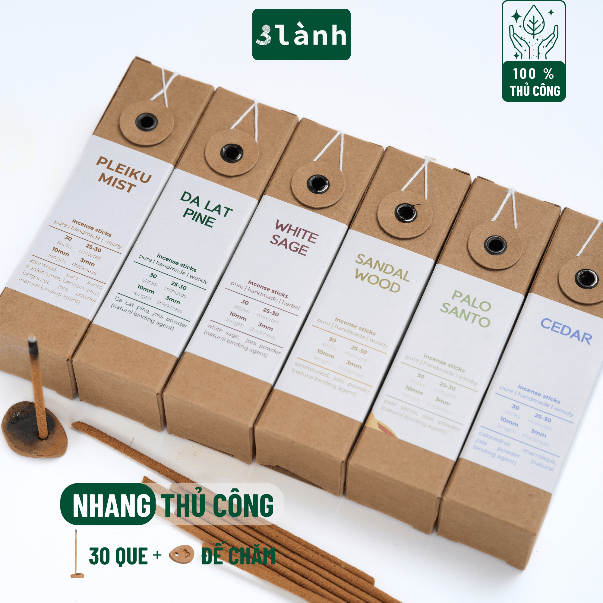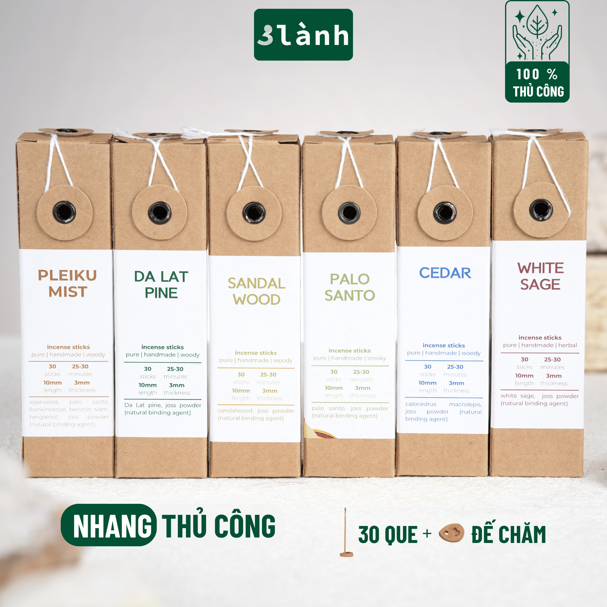 Giới thiệu Nhang Thủ Công 3 Lành Hộp 30 Que Nhiều Mùi 100 % Tự Nhiên Tặng Kèm Đế Chăm Không Hóa Chất Xông Thơm