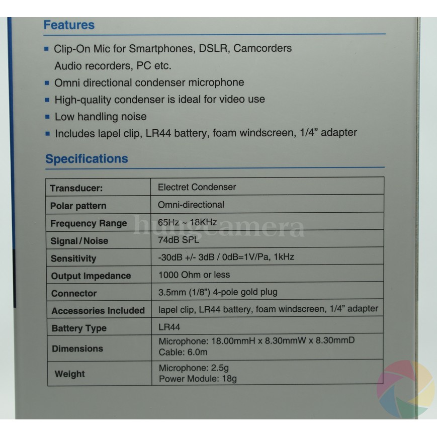 Trọn bộ bao gồm: 01 micro BOYA BY-M1, 01 Jack audio đổi 3.5 sang 6.5mm, 01 túi da, 01 Pin LR44, 01 bông lọc, 01 HDSD.
