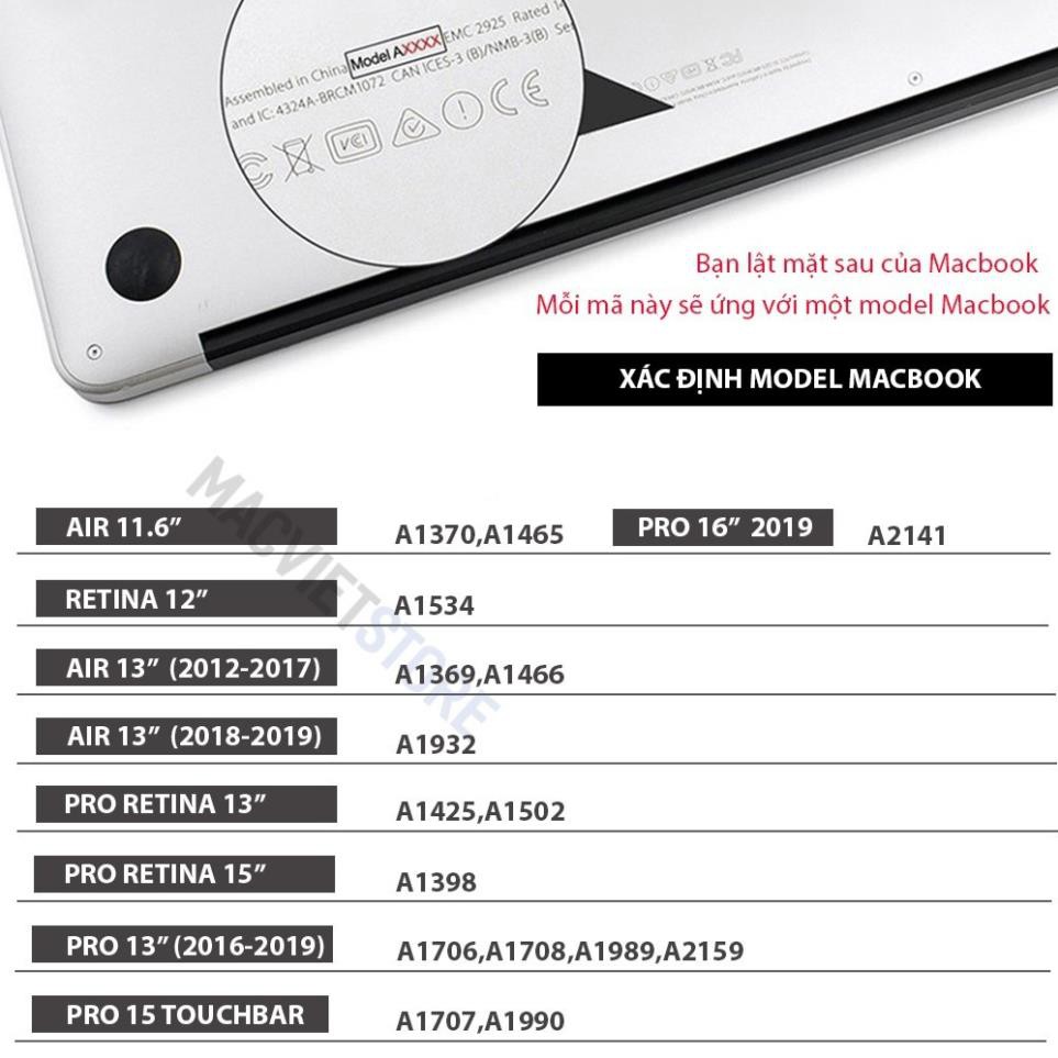 Lưu ý : Các bạn lật mặt sau của Macbook xem ghi Modell bao nhiêu nhé (VD:A1466,A1502,A1706...) để bạn chọn đúng kích thước Case cho Macbook của mình