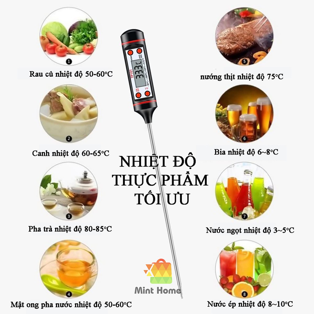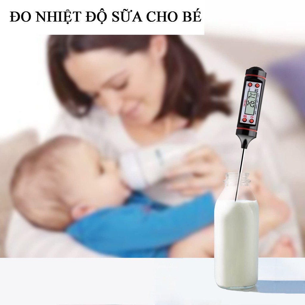 Nhiệt kế điện tử đo nước pha sữa cho bé, trẻ em, máy đo nhiệt độ thực phẩm nấu ăn, làm bánh, dầu, tắm cho phòng bếpVới thiết bị này, chúng ta có thể sử dụng để đo nhiiệt độ của nướ c, sữa, coffee, dầu, trà, súp, bia, v.v.các loại thức ăn, đồ nướng một cách dễ dàng
