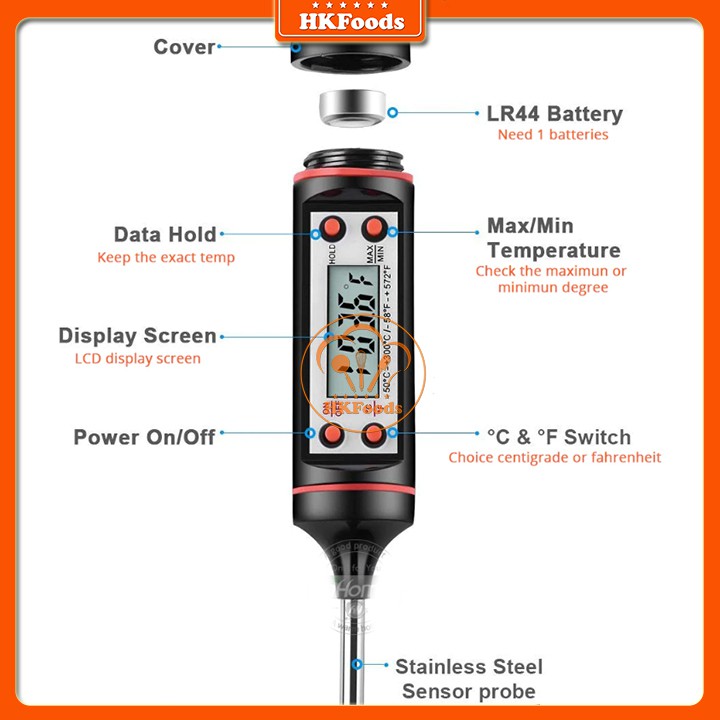 Sử dụng: đo nhiệt độ chất lỏng, dung dịch, thịt, nhiệt độ lò hoặc tủ lạnh...