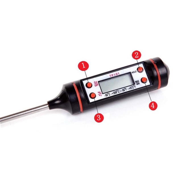Que đo nhiệt độ thực phẩm TP101 sử dụng nguồn năng lượng từ viên pin AG13 với điện áp 1.5V. Với thiết bị này, chúng ta có thể sử dụng để đo nhiệt độ của nước, sữa, coffee, các loại thức ăn, đồ nướng một cách dễ dàng. Giúp cung cấp thông tin nhiệt độ một cách chính xác, tức thì theo thời gian thực, với độ sai số khá nhỏ chỉ ±1˚C/F. Thao tác sử dụng cũng khá đơn giản, chỉ cần cắm que nhiệt kế vào thực phẩm và bấm mở thiết bị.