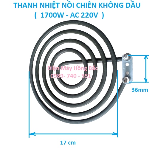 Nồi chiên không dầu là sản phẩm được sử dụng rỗng rãi và được rất nhiều gia đình sử dụng. Trên thị trường có nhiều hãng sản xuất nồi chiên không dầu khác nhau nhưng vòng nhiệt ( thiết bị làm nóng ) chỉ có bốn loại thông dụng dưới đây:- Vòng nhiệt kim loại (KL) : có 2 loại đường kính 13cm và 17cm tương ứng với công suất 1200W và 1700W điện áp đầu vào AC 220V