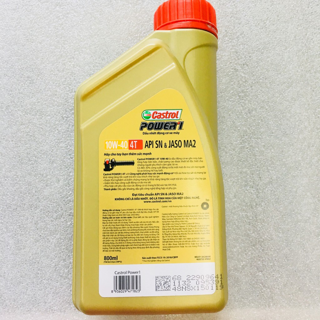 NHỚT CASTROL POWER1 10W-40 0,8L là sản phẩm chủ lực của hãng dầu nhớt Castrol suốt thời gian dài dành cho các phương tiện xe số trên thị trường Việt Nam. Đây là sản phẩm dầu nhớt xe máy được ưa chuộng bởi những người yêu thích xe số và bảo dưỡng xe số tốt. Cũng tương tự các dòng sản phẩm Power 1 khác, nhớt Castrol Power 1 4T 0.8Lđược ứng dụng công thức "Phát huy sức mạnh động cơ" trứ danh của Castrol, được pha chế đặc biệt mang lại cảm giác lướt xe trên phố thú vị