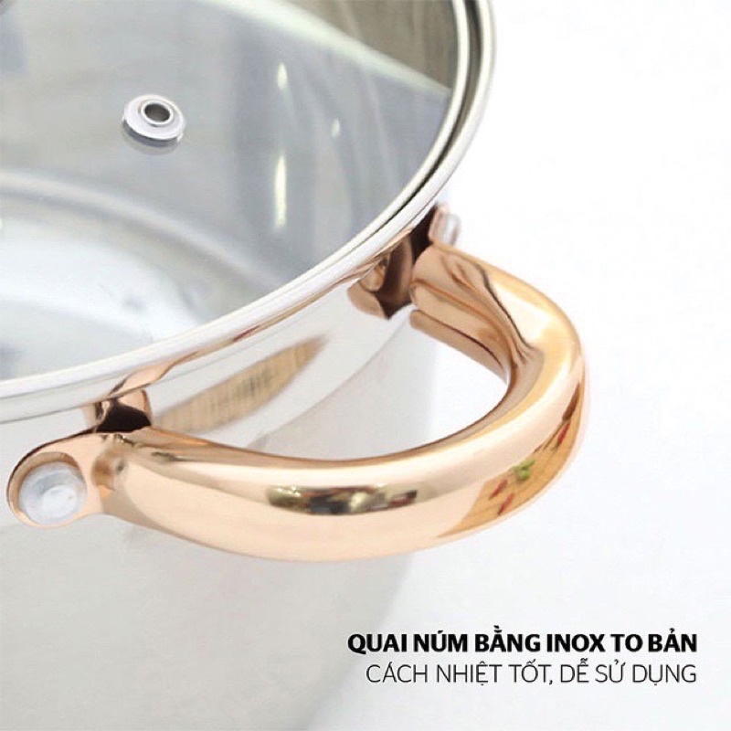 Quai nồi: inox mạ vàng sang trọng, tán đinh chắc chắn, chịu nhiệt, cách nhiệt tốt
