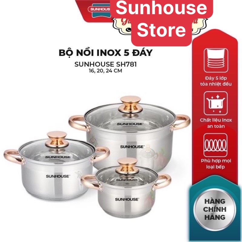 Bộ nồi inox 5 đáy SUNHOUSE SH781 sử dụng được với mọi loại bếp, kể cả bếp từ. Bộ sản phẩm gồm 3 nồi với đường kính 16cm - 20cm - 24cm phù hợp với nhu cầu nấu nướng của mọi gia đình. Nồi nhỏ 16cm thích hợp để luộc trứng, kho thịt, nồi cỡ trung 20cm để nấu canh cho 2-4 người và nồi lớn 24cm có thể luộc gà, nấu canh hoặc lẩu cho 3-5 người.