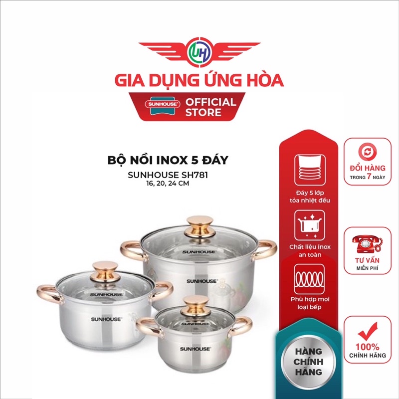 Bộ nồi inox 5 đáy SUNHOUSE SH781 sử dụng được với mọi loại bếp, kể cả bếp từ. Bộ sản phẩm gồm 3 nồi với đường kính 16cm - 20cm - 24cm phù hợp với nhu cầu nấu nướng của mọi gia đình. Nồi nhỏ 16cm thích hợp để luộc trứng, kho thịt, nồi cỡ trung 20cm để nấu canh cho 2-4 người và nồi lớn 24cm có thể luộc gà, nấu canh hoặc lẩu cho 3-5 người.